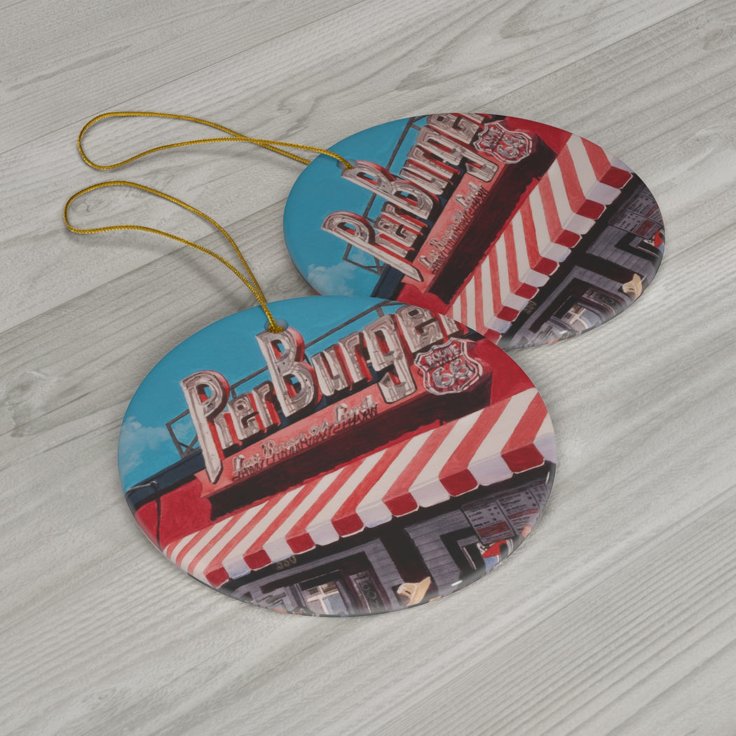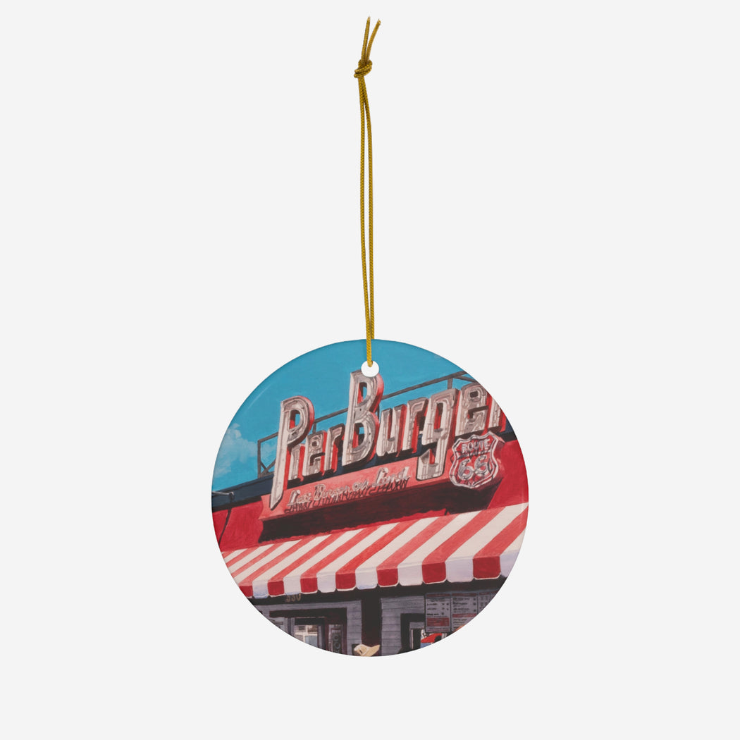This custom-made ceramic ornament can be the perfect heirloom to use year after year, printed with Tony De Luz's Pier Burger.