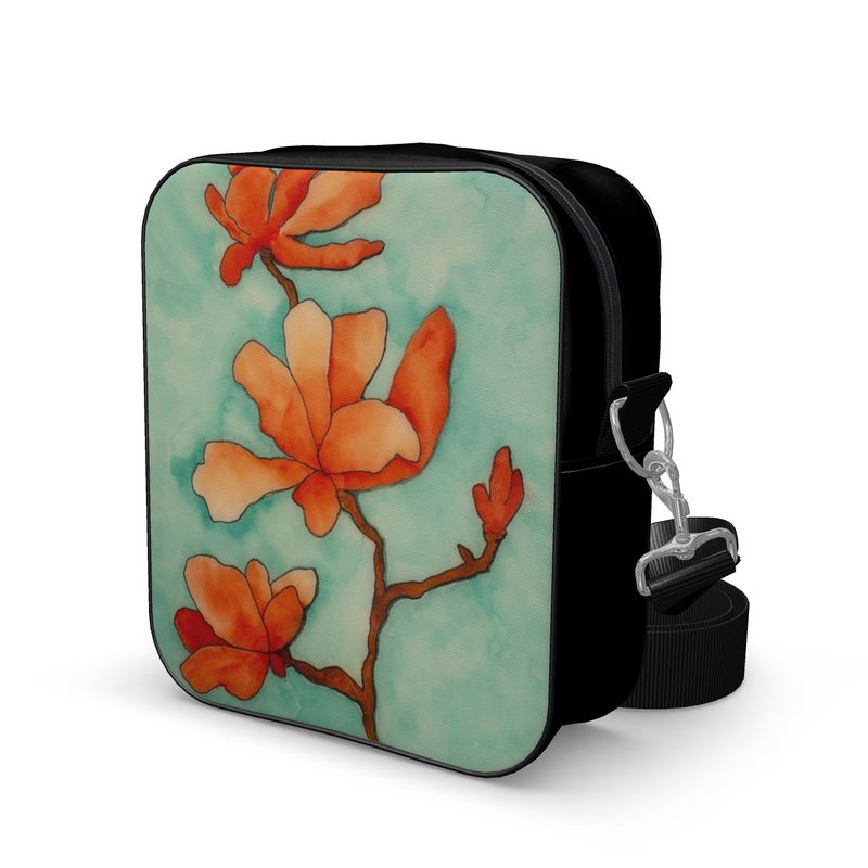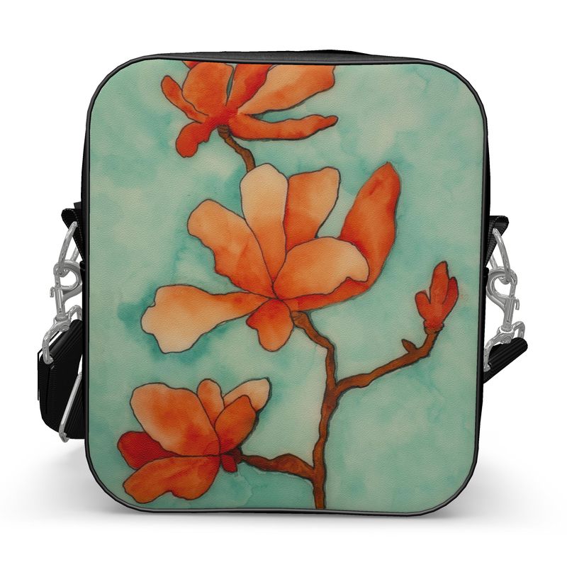 Classic leather messenger bag imprinted with Helen K. Tindel’s Baraka Blooms.