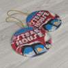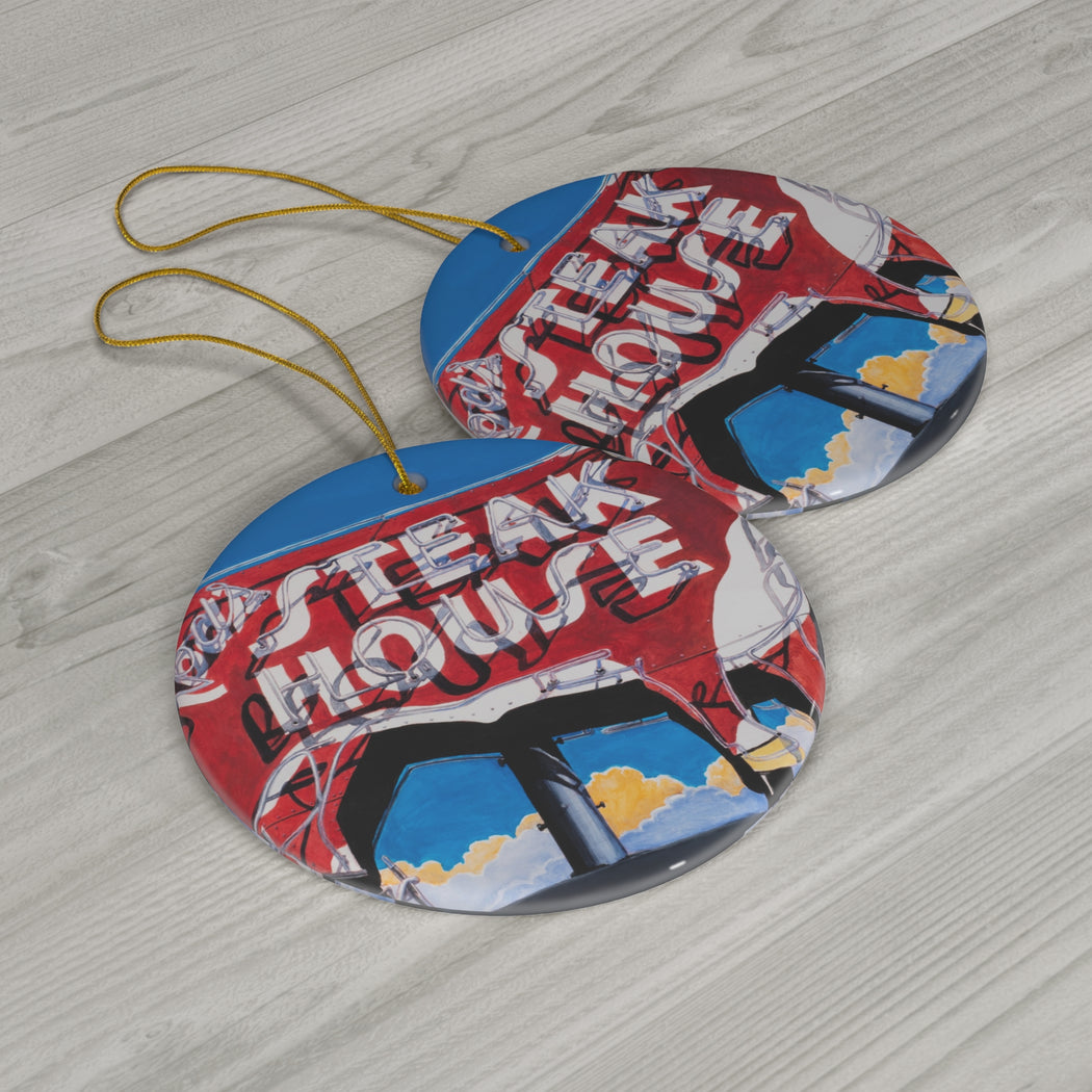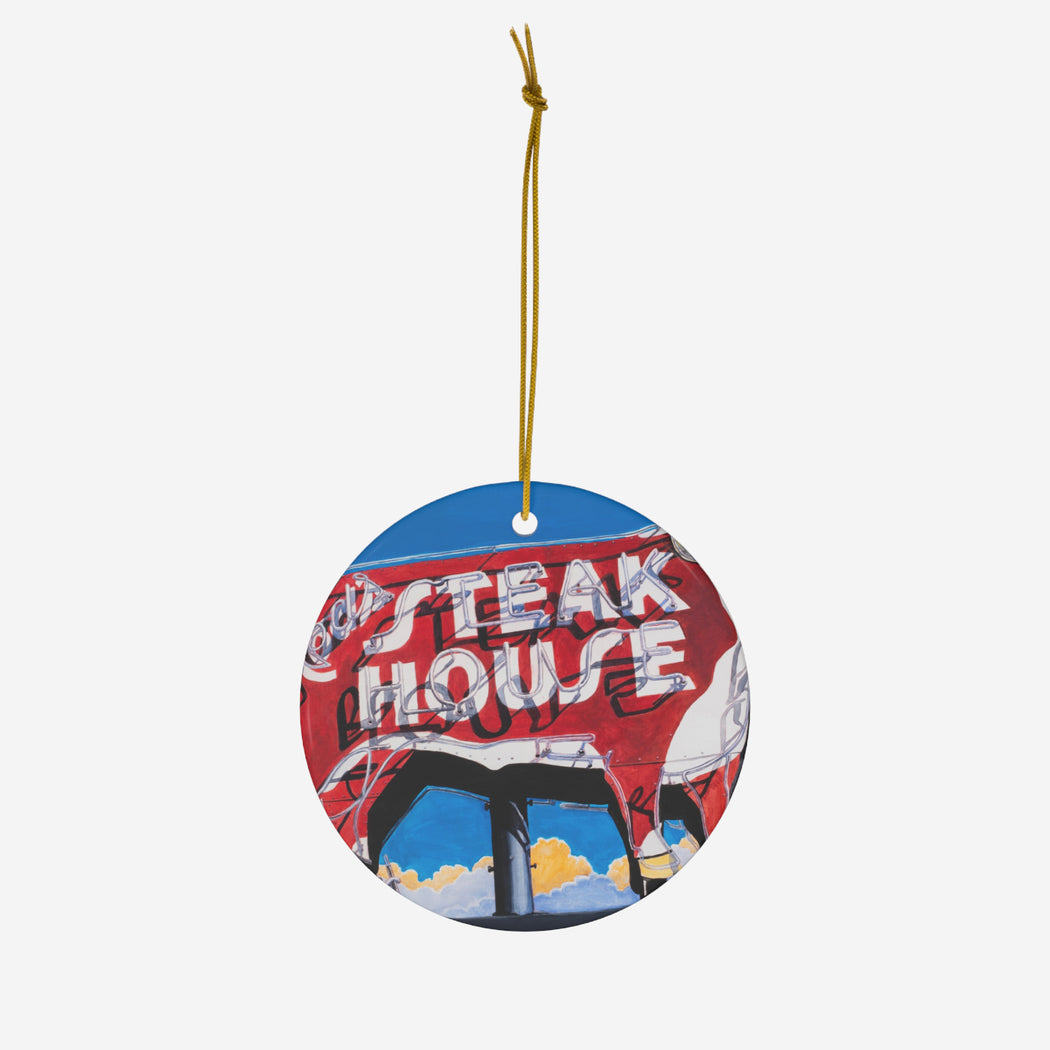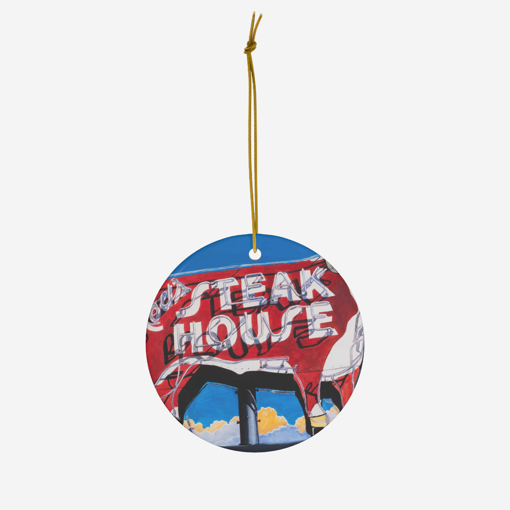 This custom-made ceramic ornament can be the perfect heirloom to use year after year, printed with Tony De Luz's High Steaks.