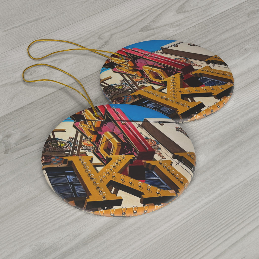 This custom-made ceramic ornament can be the perfect heirloom to use year after year, printed with Tony De Luz's Kimo Theater.